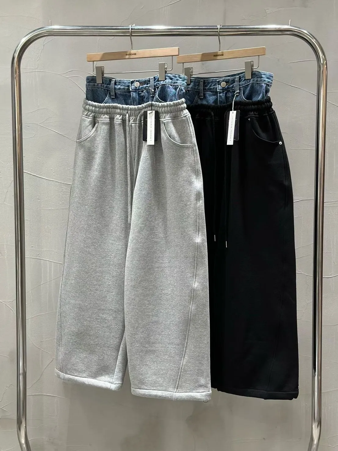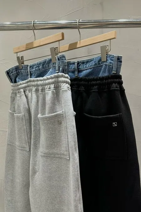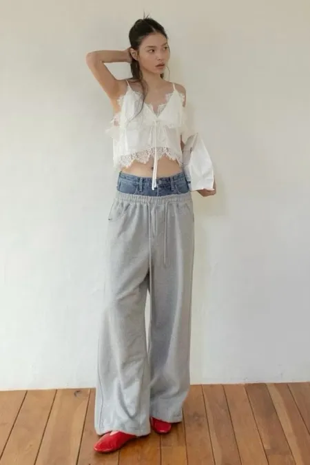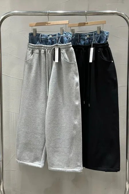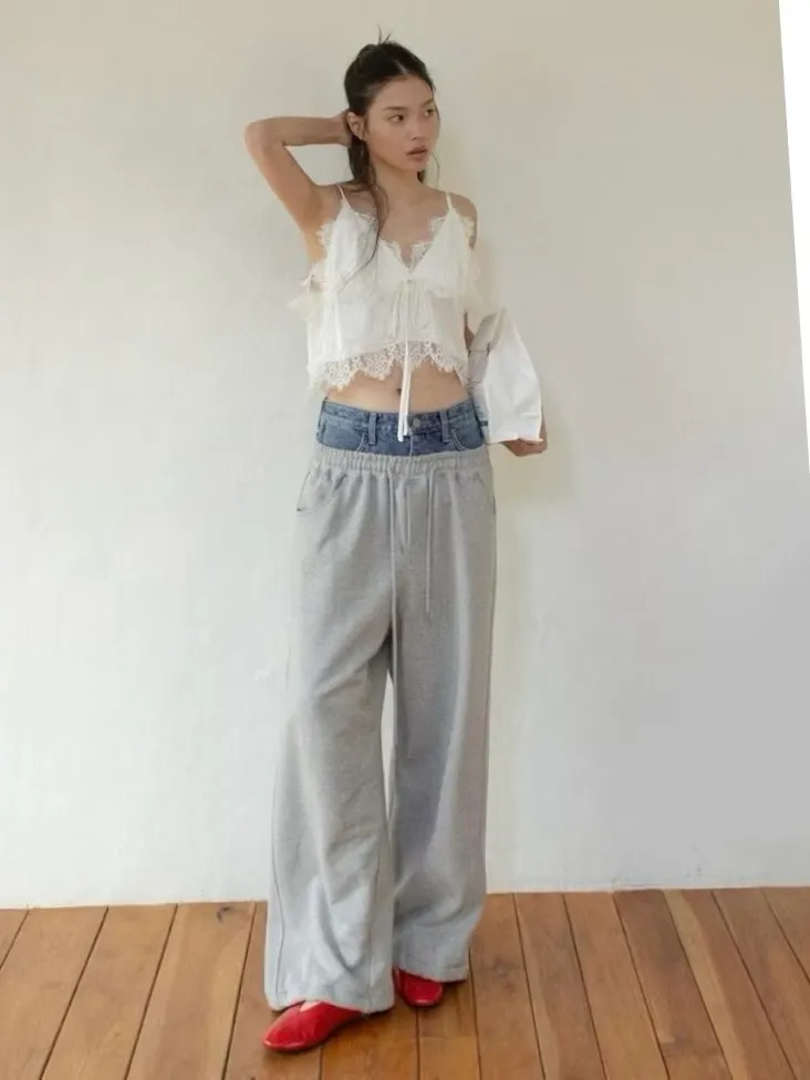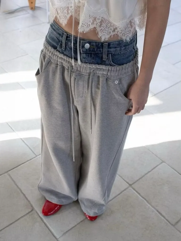 腰拼接牛仔棉彎刀褲