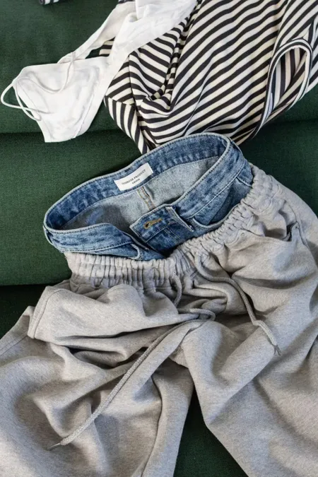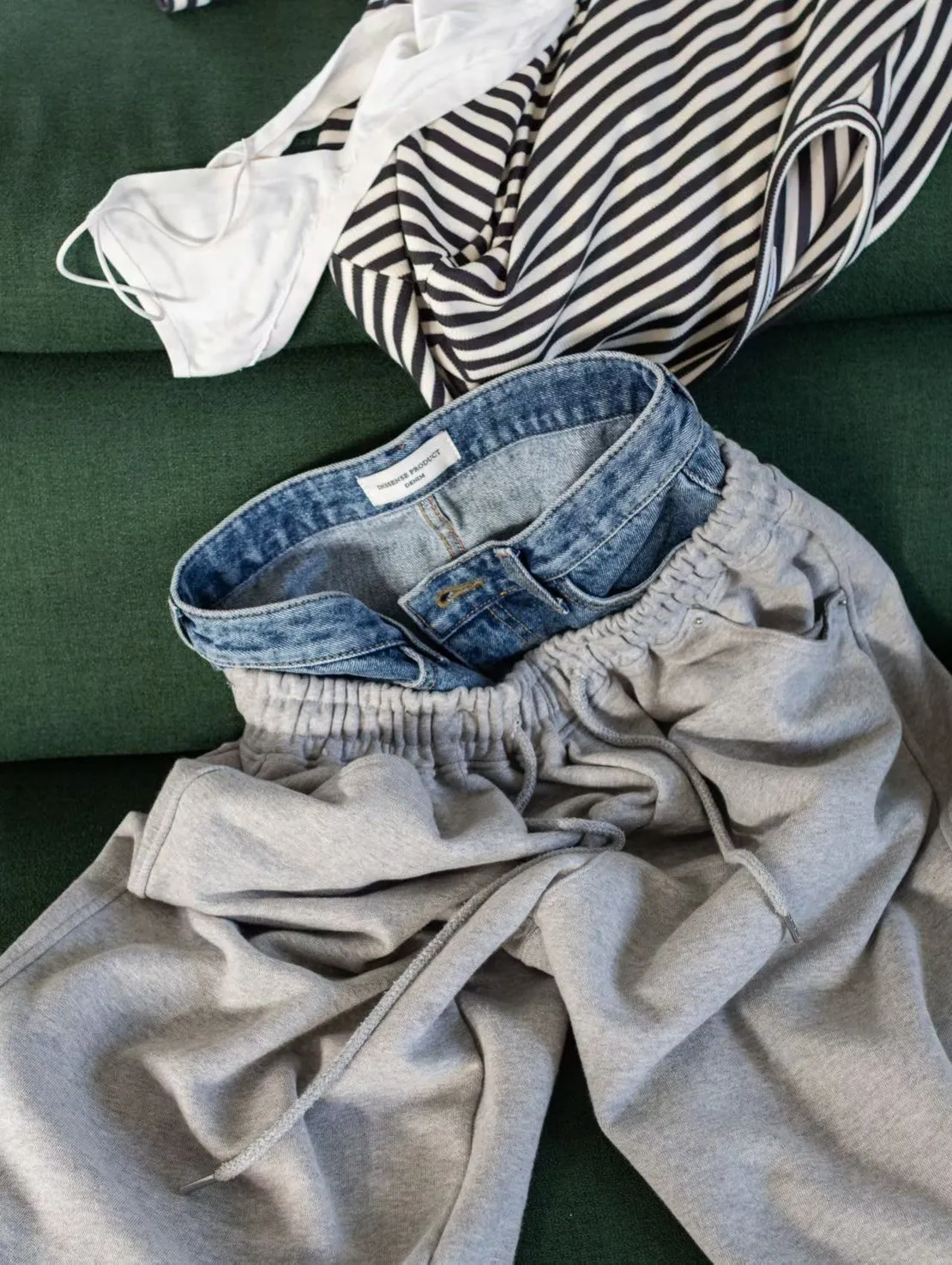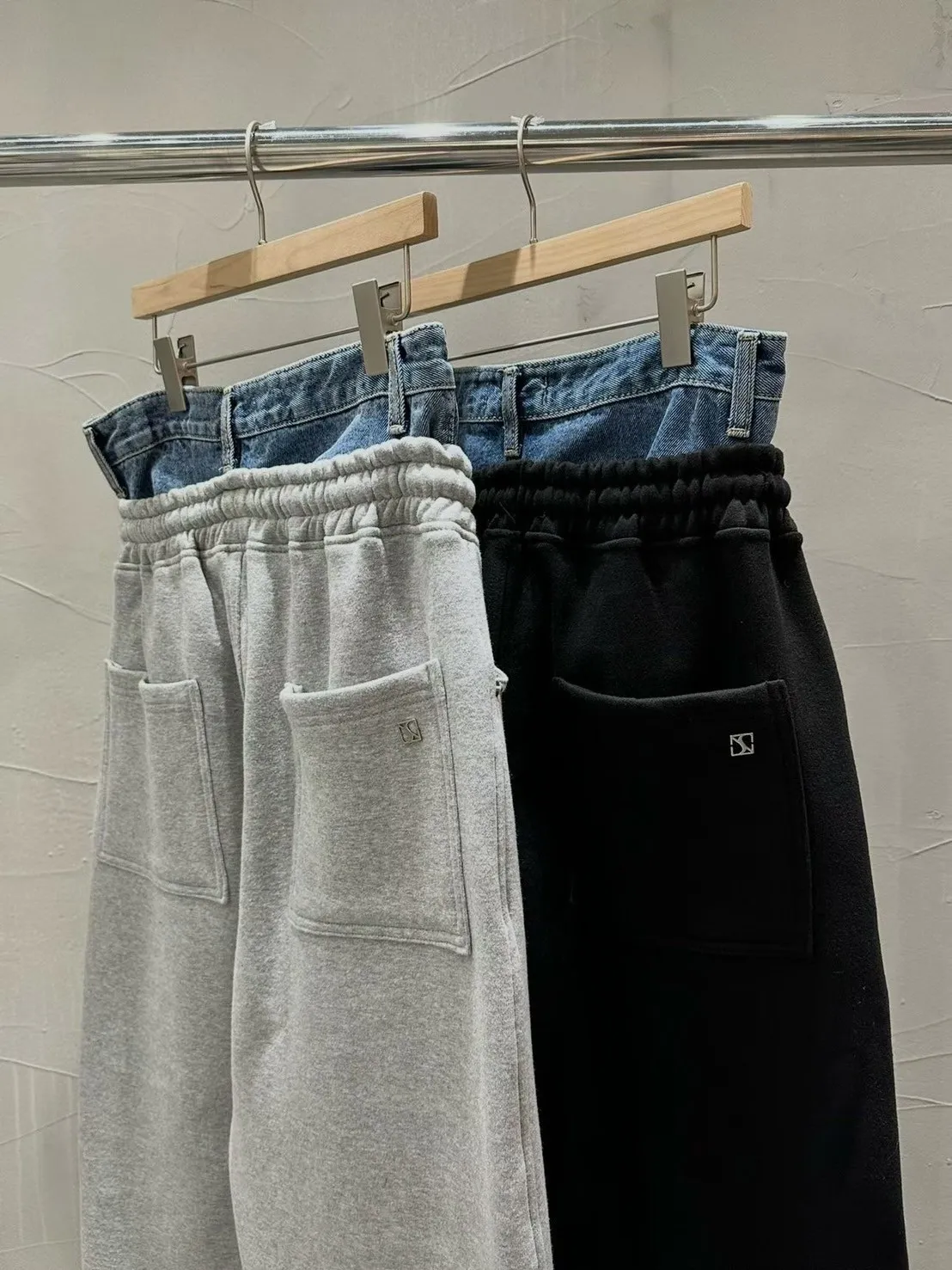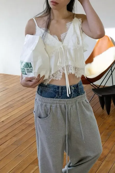 腰拼接牛仔棉彎刀褲